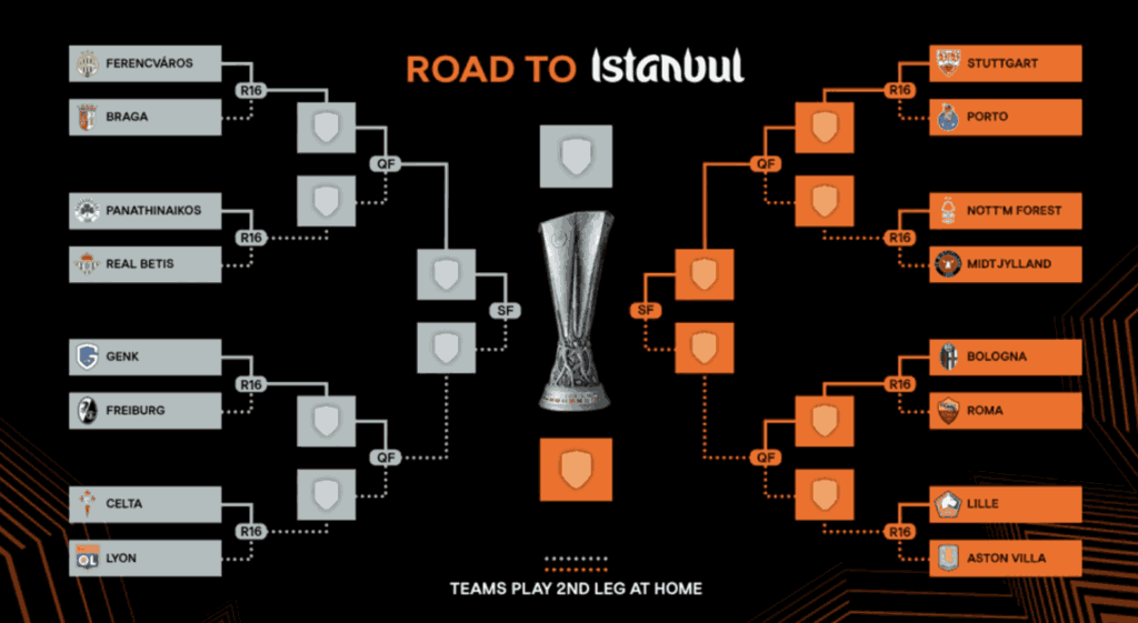 Στο άλλο κομμάτι η Ρόμα και η Άστον Βίλα αν περάσουν Μπολόνια και Λιλ αντίστοιχα σταυρώνουν μεταξύ τους στους «8» και μία θα μείνει έξω… Χαμός πραγματικά. Υπάρχει και ζευγάρι Πόρτο – Στουτγκάρδη που ο νικητής σταυρώνει λογικά με Νότιγχαμ (ή Μίντιλαντ).