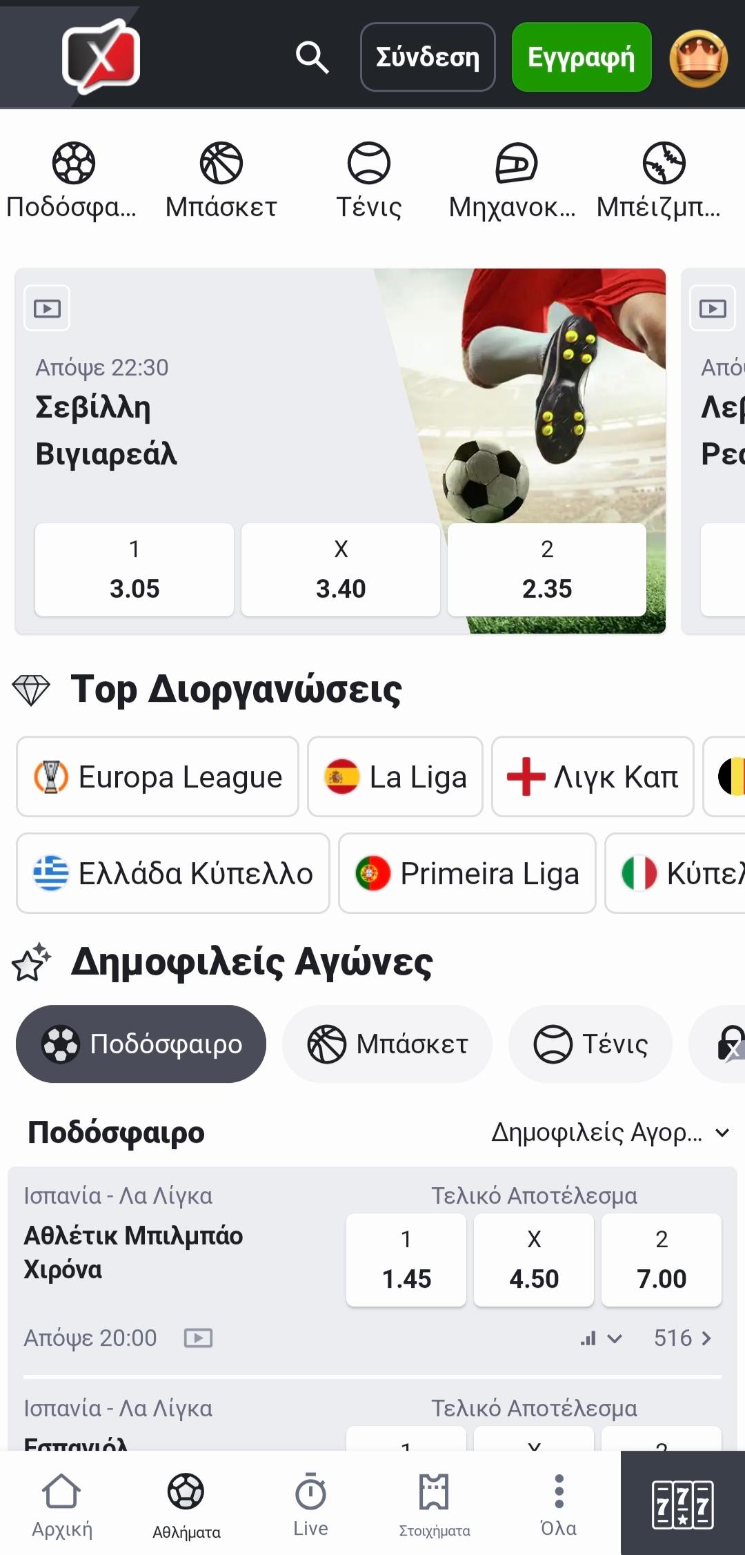 Στο κομμάτι της πλοήγησης τα πράγματα είναι πλήρως κατανοητά αφού το βασικό μενού βρίσκεται στο κάτω μέρος της οθόνης (Αρχική-Αθλήματα-Live-Στοιχήματα-Όλα-Καζίνο).