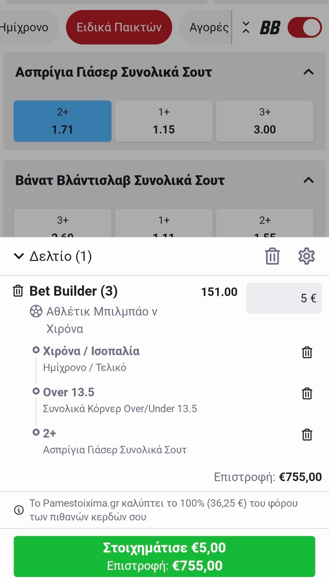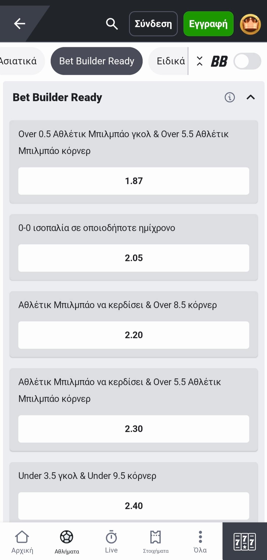 Η ποικιλία καλύπτει μέχρι και τους πιο απαιτητικούς παίκτες, όμως το παιχνίδι δεν σταματά εδώ αφού εκτός των παραπάνω προσφέρεται και λειτουργία Bet Builder. Παράλληλα υπάρχουν και έτοιμοι συνδυασμοί στην κατηγορία Bet Builder Ready, ενώ σε πολλές αγορές προσφέρονται συχνά ενισχυμένες αποδόσεις.