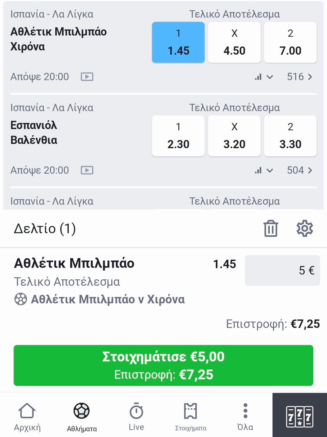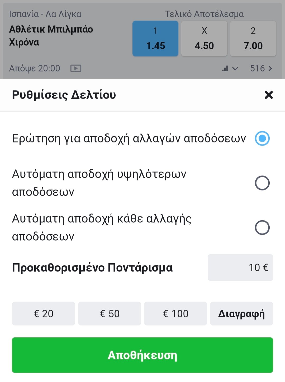 Στο κομμάτι του πονταρίσματος, στο δελτίο προσφέρονται προκαθορισμένα ποσά (20€, 50€, 100€) ενώ προσφέρεται στον χρήστη η δυνατότητα να ορίσει ο ίδιος custom ποσό. Παράλληλα, υπάρχουν ρυθμίσεις σχετικές με την αποδοχή αλλαγής αποδόσεων.