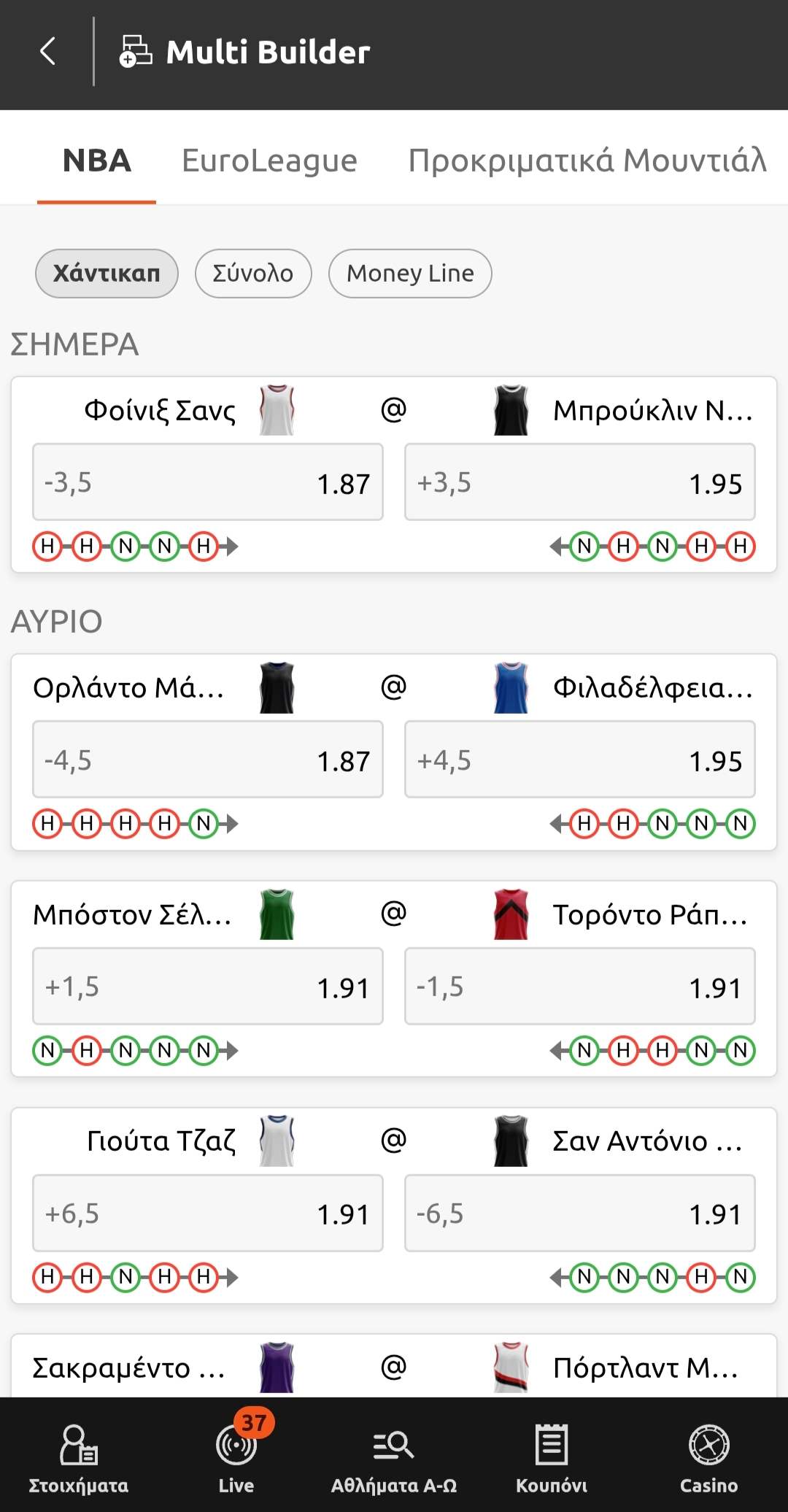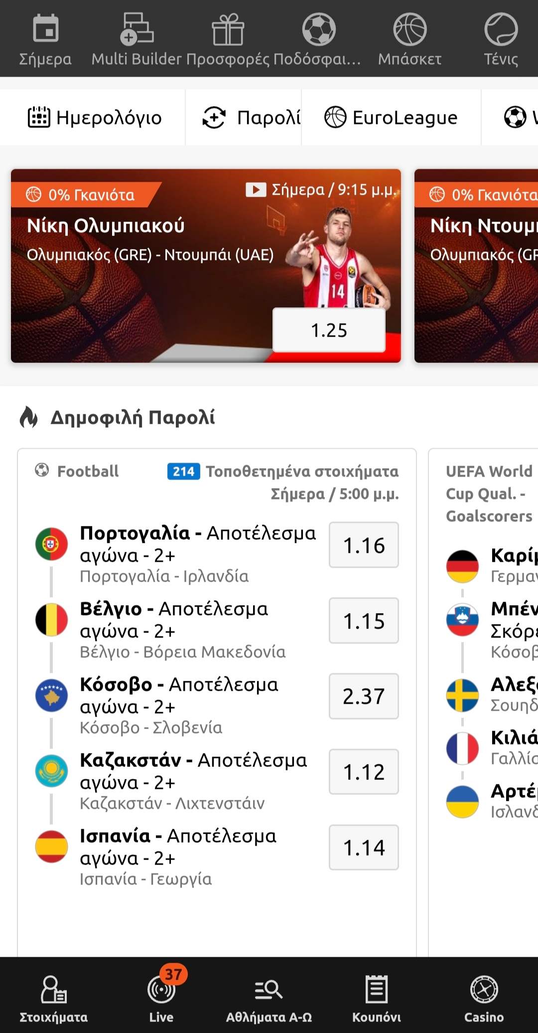 Οι κεντρικές επιλογές είναι χωρισμένες σε δύο μέρη. Στο επάνω τμήμα θα βρείτε τις αγορές ημέρας, τη σελίδα προσφορών, τα δημοφιλέστερα αθλήματα και τη λειτουργία Multi Builder.