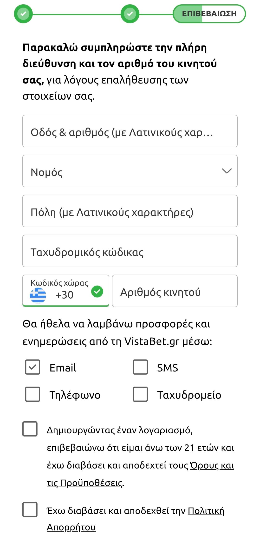 Ανοίγωντας το Vistabet app, πατήστε την επιλογή «Εγγραφή» που βρίσκεται επάνω δεξιά στην οθόνη. Έτσι, θα εμφανιστεί η φόρμα εγγραφής, όπου θα πρέπει να συμπληρώσετε τα παρακάτω: