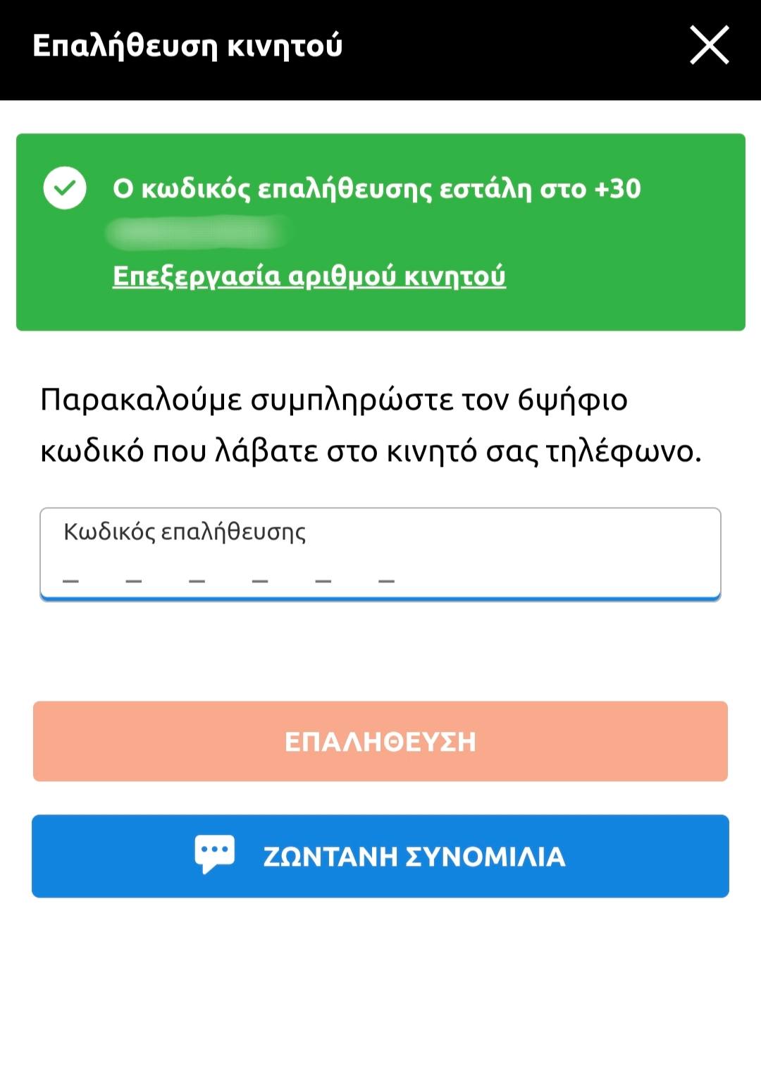 Αφού καταχωρήσετε σωστά τα στοιχεία σας, θα σας ζητηθεί να εισάγετε τον 6ψήφιο κωδικό επιβεβαίωσης που θα έχετε λάβει μέσω SMS στον αριθμό που δηλώσατε.